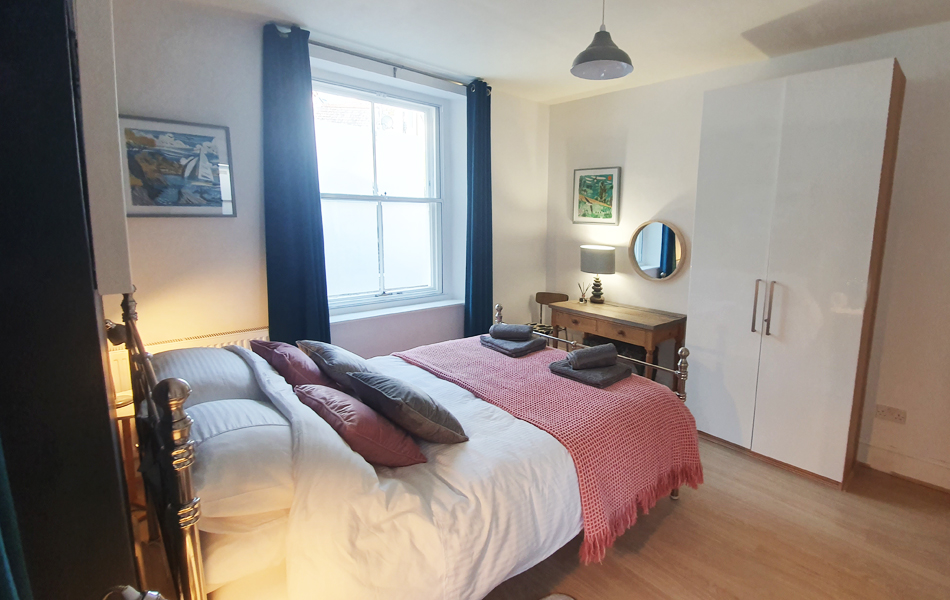 The generous bedroom has a kingsize (5ft) traditional Victorian-style bed frame with a luxurious, deep, British-made pocket sprung mattress with extra topper, plump pillows, cosy duvet and 100% cotton bedlinen. Every care has been taken for a peaceful night’s sleep.